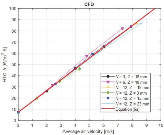 The relationship between the HTC and air velocity, , is already established in the published literature and it is described by Equation (6a). It was confirmed also by the CFD results, where Figure 11. shows the in the end-winding region for variety of blade configurations.