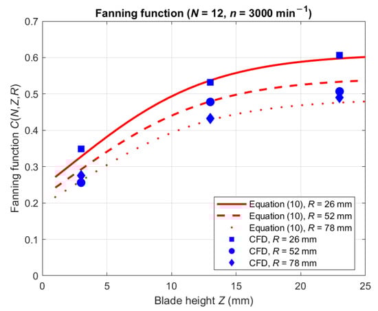 Figure 12 and Figure 13 show the fanning function vs. blade height ( = 12) and the number of blades ( = 18 mm), respectively, at a rotor rotational speed of 3000 min−1. In both graphs, the analytically calculated values by Equation (10), illustrated with red lines, as well as CFD results, marked with blue points, are shown for three different radii (26 mm, 52 mm, and 78 mm). Both figures visualize the correct behavior of the analytical equation (Equation (10)), also with slight extrapolation outside the specified range.