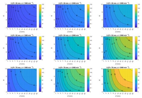 Value of HTC h (in (W/m2K)), calculated by analytical model (13), for different rotor radii, rotational speeds, number of blades, and blade height.