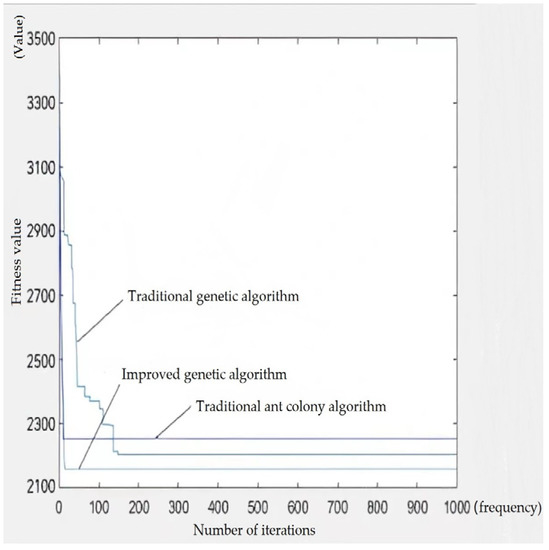After 1000 iterations, the total target optimization fitness obtained by the three optimization algorithms is shown in Figure 8. In the process of 1000 iterations, the improved genetic algorithm always has the lowest adaptation value and the highest optimization quality, which effectively avoids the blind search at the beginning of the iteration and the problem of excessive search time and local optimization of the simple algorithm, and obtains a high-quality solution for the optimization of the distribution route of the community group buying logistics. The improved genetic algorithm has strong global optimization ability, and the total costs and carbon emissions are the lowest based on considering time, penalty cost, and customer satisfaction. The distribution routing scheme determined in this way enables just-in-time delivery, which improves the quality of delivery services.