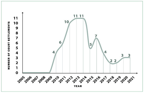 The first rulings on spatial plans related to wind power plants appeared in 2010 (Figure 4). There were not many such rulings per year (although it is still important to remember the relatively small number of such spatial plans). There has been a noticeable decrease in the number of such cases after 2016. Between 2010 and 2015, 65.278% of the group of all analysed settlements were issued. This is related to the fact that, in 2016, legislation introduced the developed distance guidelines necessary to be applied in spatial plans permitting wind turbines. This contributed to a decline in new spatial plans and was also reflected in the number of court cases. In the first period, there were decidedly more cases in which allegations of violation of property rights were made explicitly (57.477% of the total number of cases in this period). Between 2016 and 2021, the number of such cases decreased (42.857%). The number of cases in which formal allegations were made in both periods was similar (25.532% and 28.571%, respectively). In the first period, the number of cases in which the courts substantively assessed the content of the plans was higher (38.298% of cases in which the courts declared the plans invalid and 42.553% of cases in which the courts dismissed the plaintiffs’ objections). In the second period, there was a significant increase in the number of cases in which complaints were dismissed on formal grounds (23.809% of cases each, ending with both annulments of plans and substantive dismissal of complainants’ objections).