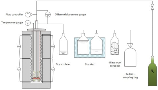 The studied biomass was first dried to 2–3% humidity (Wa) before being pulverized into particles smaller than 10 mm in diameter. The resultant mixture (which contained the investigated polymer blends and biomass) was put in a steel retort and co-pyrolyzed under a nitrogen atmosphere. An electric furnace, a steel retort (where the tested materials were converted), and a system for collecting the liquid and gaseous products comprised the test setup. Figure 1 displays a schematic of the solid fuel thermal conversion system. Nitrogen was injected from the bottom of the retort at a rate of 3 dm3/h. The retort was purged with nitrogen for 15 min prior to pyrolysis, and the treated material was then heated to the aforementioned temperature at a heating rate of 10 K/min. After attaining the required temperature, it was held for 30 min before the sample was cooled to room temperature. The laboratory-scale setup was similar to that employed in previous investigations []. During the procedure, char, liquid, and gaseous samples were collected for future study. To confirm that the reactions were reproducible and stable, the reactions were performed in triplicate.