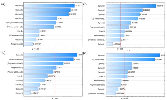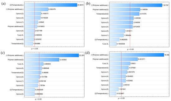 Pareto charts for (a) H2, (b) C3H8, (c) C3H6, and (d) C4H10 (all variables characterised by bars exceeding the p = 0.05 limit had a statistically significant effect on the parameters under study).