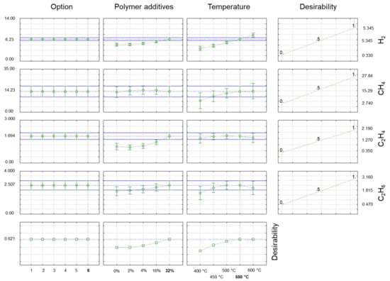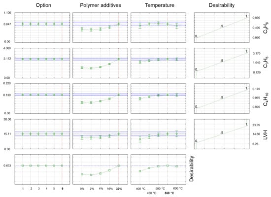 In Figure 4 and Figure 5, the desirability chart shows how the studied properties of gas products obtained during co-pyrolysis changed under different process conditions. The utility function used here assumed that during the optimisation process, the maximum hydrocarbon content was sought while minimising the carbon monoxide and carbon dioxide content of the gas product. The utility function (right side of Figure 4 and Figure 5) had a linear form, and it assumed a value of 0 (undesirable result) for the minimum value of the hydrocarbon under test and a value of 1 (desirable result) for the maximum value of hydrogen and the hydrocarbons for the test. In the case of carbon monoxide and carbon dioxide, the course of the function was reversed, with a value of 1 (the desired result) for the minimum content of CO2 and a value of 0 (the undesirable result) for the maximum content of CO2 in the gaseous products of the co-pyrolysis process. In this case, the total utility function (bottom part of Figure 4 and Figure 5) was the result of the utility functions for hydrogen, the labelled hydrocarbons, CO2, and thus also the LHV value.