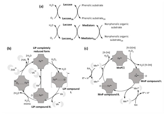- Kumar, A.; Chandra, R. Ligninolytic Enzymes and Its Mechanisms for Degradation of Lignocellulosic Waste in Environment. Heliyon 2020, 6, e03170. [Google Scholar] [CrossRef] [PubMed]