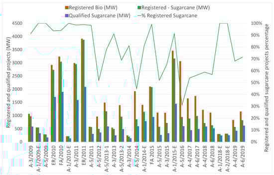 Concerning the technical qualification defined by the Brazilian government for the registered projects in the auctions, sugarcane bioelectricity projects have an average rate of 58% qualified (the straight blue line in Figure 1), which means that on average, 58% of registered bioelectricity projects can fill the obligations necessary to participate in the power auction. The relatively small value is mainly because of environmental licensing, location usage rights, and problems in connecting the project to the basic distribution grid []. All of these elements are recognised as barriers to greater investment in biomass power sources.
