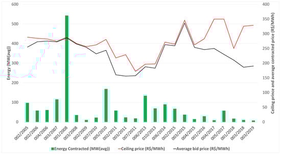 Between 2009 and 2019, approximately 4000 MW of installed capacity and 13,578 GWh of average energy were procured []. It is interesting to notice that the average capacity of those projects is approximately 50 MW [], in general, associated with medium and great mills, as small mills are not competitive. Figure 2 shows the considerable variation in price ceilings for those projects, stable until 2010, with the lowest price in 2011.