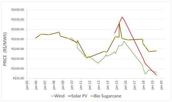 The analysis of bioelectricity competitiveness in the energy auctions was based on secondary data collected and systematised from all auctions through October 2019 (a total of 12 auctions) run by the Chamber of Commercialization of Electric Energy (CCEE in its Portuguese acronym) []. The data included registered projects, procured volume, initial maximum price, average procurement prices, and investment prices. All costs were adjusted to 2019 levels [,].