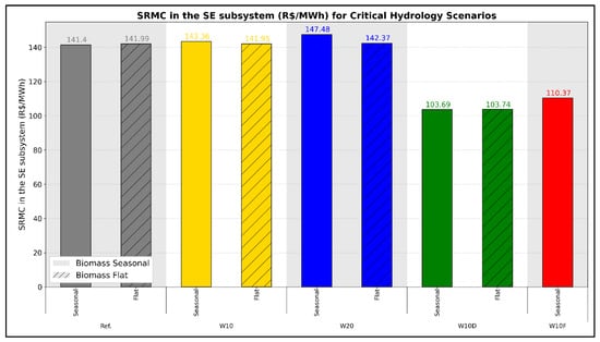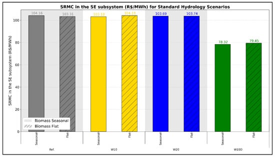 Secondly, when comparing the seasonal and flat biomass generation for each case, it is possible to notice that the flat biomass generation slightly reduced SRMC values by 1% and 3.5% for scenarios with load and biomass addition of 10% (W10) and 20% (W20), respectively. In the reference and in the W10D scenarios, the flat case was less than 0.5% more expensive than the seasonal one. It likely occurred due to the biomass addition’s impact on the netload. While the flat biomass generation affects the net load equally in the whole year, the seasonal biomass generation has greater impact in the year’s dry season and none in the wet period. Therefore, considering the fact that the hydrology is based on a drought period, the hydropower generation cannot deal with the load addition that is supposed to be supplied by biomass. It is emphasised in the stochastic case because of the uncertainty that the system must manage.