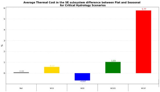 Percentage difference between flat and seasonal cases for average thermal cost in the southeast subsystem for scenarios with critical hydrology.