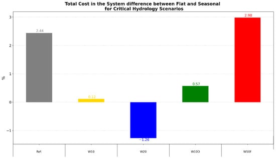 Percentage difference between flat and seasonal cases for total cost in the system for scenarios with critical hydrology.