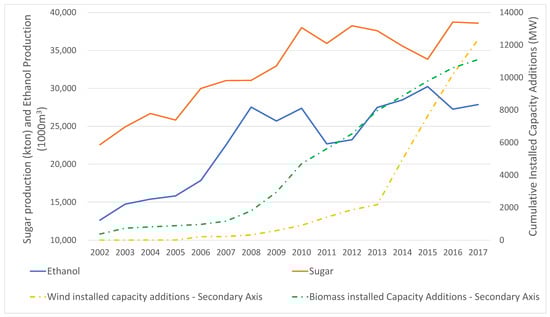 In the last 20 years, evidence suggests that the sugarcane-derived bioelectricity installed capacity expanded concomitantly with the sugar and (mainly) ethanol market expansion. Figure 8 presents the bioelectricity and wind power installed capacity growth from 2002 to 2017, clearly showing the correlation of the bioelectricity installed capacity expansion with the expansion of the sugar-energy sector, which increased sugar and ethanol production by 71 and 121%, respectively [].