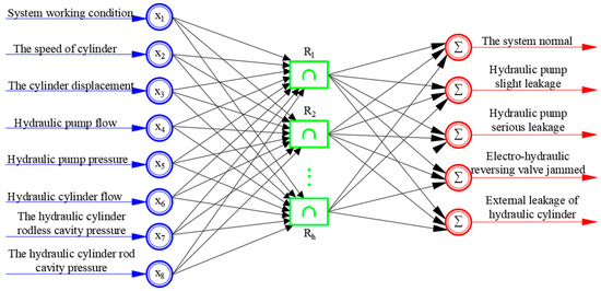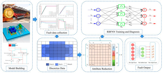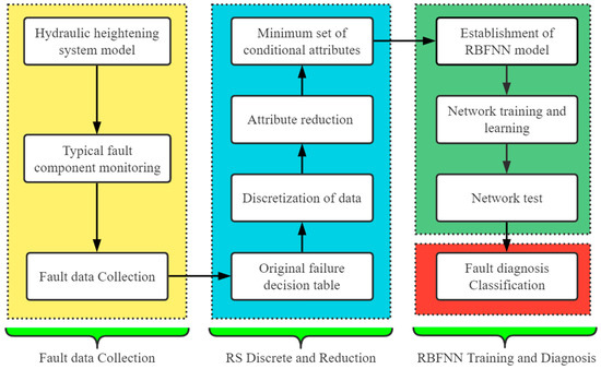 - The minimum attribute reduction set was used as the input of the RBFNN. The mapping relationship between the fault symptoms and categories of the RBF neural network was used for learning and training. Finally, the fault diagnosis classification results of the shearer hydraulic heightening system were obtained.