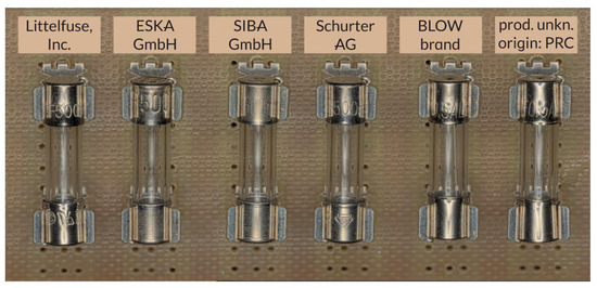 In order to conduct tests that are as universal as is feasible, it was impossible to distinguish a specific rated current value, which was statistically applied the most in modules and devices belonging to electronic security systems. It is always an individual issue and is strictly related to the wiring diagram, the characteristics of the circuit itself and the nature of forcing actions at which a given electronic device operates. For this reason, the authors decided to use fuses with a rated current of 500 [mA], since the testing current values provided by the measuring add-on are greater multiples of the adopted rated current.
