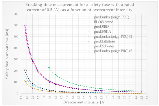 A group of products exhibiting significantly shorter breaking times begins with products by the American Littelfuse, Inc. company and the German manufacturer ESKA Erich Schweizer GmbH, with a slight advantage of the components manufactured by the first of the enterprises, for overcurrents up to 3.5 [A], inclusive. In this scenario the breaking time ratio in relation to the tested fuse-links with the longest breaking times is variable, but in both cases, the worst coefficients (breaking time ratio of BLOW fuse-links related to the results for Littelfuse, Inc. and ESKA Erich Schweizer GmbH) of 8.64 and 9.05, respectively, were obtained for a current of 1.5 [A]. On the other hand, the most advantageous, also in both cases, was achieved for an overcurrent of 11.5 [A] and amounted to 6.35 and 4.91, respectively.