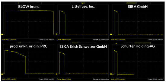 Due to the rather surprising measurement results for BLOW fuses, the authors deviated from the previously characterised measurement methodology. Both issues are explained in more detail further in this article. Test results are shown in Table 2, and their graphic form is illustrated in the form of time–current characteristics in Figure 3. Three measurement series were conducted in the case of fuse-links distributed by Lamex.