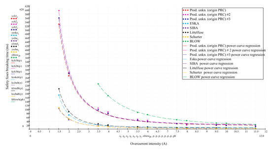 Analysing measurement results involved developing mathematical models of the time–current characteristics of the tested miniature fuse-links from various manufacturers, using both linear and non-linear regression techniques supported by the Mathcad computation environment. The best results were obtained for the regression function in the power form (14). The authors would like to point out that, in theory, the manufacturers of the investigated subassemblies have the best technical capabilities and it is in their best interest to make every effort for such models of their products to be created and to describe the nature of their operation as faithfully as possible. Of course, it is possible in cooperation with independent research centres or within in-house research and development departments. As shown by research, the best mathematical model of time–current characteristics can be obtained by conducting a significant number of measurement series using a considerable volume of the research material in the form of fuse-links intended for destructive testing, which can only be provided, at a low cost, by their manufacturers.