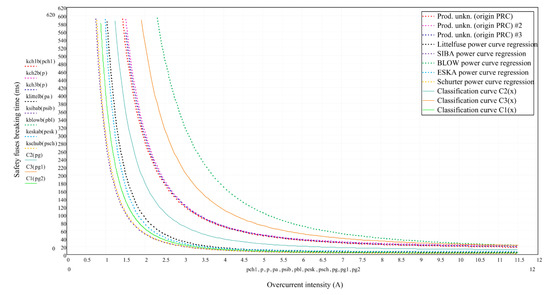 The authors would like to emphasize that, due to computation environment restrictions involving the possibility of simultaneous presentation of a maximum of sixteen data series on one graph, it was impossible to have Figure 6 show measurement points reflecting practical test results, curves representing mathematical models of time–current characteristics for the analysed fuse-links and the classification curves all at once. For this reason, it was decided to aggregate the last two of the aforementioned groups in Figure 7. Its analysis indicates that the C1(x) curve separates fuse-links with very good electrical circuit protection effectiveness from those exhibiting a good level of protection. In turn, the C2(x) curve splits components into those with good and average levels. And finally, curve C3(x) divides the studied products into those with an average level and a safety hazard level.