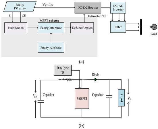 This study uses a grid-connected PV system with different control strategies for MPPT schemes as illustrated in Figure 1a. In this figure, the PV model used is of 75 PV arrays further connected to the PCC of the power grid through an inverter and DC–DC booster converter circuit. The two stage PV system uses a DC–DC boost converter to increase the voltage level of the PV array in order to standardize it for grid connection. Typically, for the grid connection, the inverter input voltage should be higher than the inverter output voltage in order to avoid instability issues due to reverse power flow. Moreover, for testing purposes, various faults are introduced in the PV array that practically impact the power output of the PV system. The output parameters such as current and voltage from PV arrays are fed into the MPPT scheme for estimating the duty cycle, D. Here, the MPPT scheme shows the FL control scheme for the sake of clarity in the test model specifics. In Stage I of the FL-based scheme, error (E) and change in error (CE) are computed by estimating current, voltage, and power, which are then used for defining fuzzy rules. The IF–THEN fuzzy rules are used for defining IMFs and OMFs in Stage II. The membership functions are defined such that they accurately yield the estimated duty cycle through mapping of MFs.