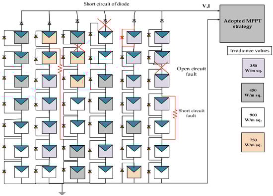 In this study, five different PV faults are introduced on monocrystalline and thin film PV arrays for finding the effectiveness of the adopted control strategies. The considered PV faults are illustrated in Figure 3. The investigated faults are given as [,]: