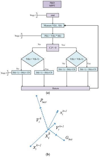 Different stages in the P&O scheme: (a) The flow diagram of the P&O MPPT scheme. (b) Particle movement during optimization.