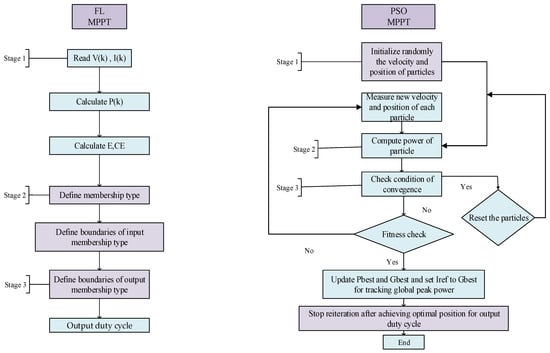 This section proposes the strategies utilized for the operation of different PV technologies under multiple faults. Two different MPPT strategies, including PSO- and FL-based controls, are designed for tracking the maximum power point in this research study. The two intelligent control strategies are also compared with the conventional P&O MPPT scheme in terms of extraction of peak power under multiple fault scenarios and for changing environmental conditions. The conventional P&O algorithm is unable to track the accurate peak power under dynamic environments such as abrupt temperature and irradiance variation and during fault conditions. On the other hand, the PSO strategy tracks the power point by randomly initiating the position and velocity of particles. The PSO scheme is an optimization strategy that can accurately track the maximum power point for PV arrays. It is an efficient strategy for extracting peak power under dynamic environmental conditions. The FL-based control scheme uses fuzzy logic rules for controlling the duty cycle through defining membership functions. Furthermore, these techniques will be tested under multiple fault conditions and variable environment conditions. The aforementioned control techniques are further discussed in detail in the following sub-sections.