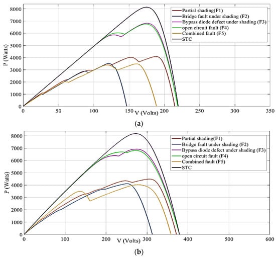 Five different fault scenarios are considered for the computation of power under several faulty conditions, including partial shading, bridge fault under shading, bypass diode failure under shading, open circuit, and combined fault. The characteristics curves of several fault states are indicated in Figure 6a,b. Multiple peaks in the curve appear due to the manifestation of PV faults. Shading of the PV array further deteriorates the performance of the PV array. The CIGS array outperforms the crystalline PV in terms of characteristics curve analysis. The tracking of peak power through conventional control schemes like the P&O algorithm is difficult in the considered fault scenarios. Thus, smart controllers like PSO and FL are designed for increasing the tracking of peak power under these fault scenarios. All of the test cases are shown in Table 4, Table 5 and Table 6, while the simulation results are illustrated in Table 7.