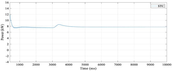This section presents analysis of the impact of the faults on power output from a PV system. Firstly, tracking of peak power is observed under standard test conditions (STC) for the proposed system. The MPPT begins adjusting across varying D upon enabling MPPT at 3100 ms in the P&O algorithm. As shown in Figure 7, approximately 7900 W of peak power is traced with a tracking time of 3400 ms at 1000 W/m2 irradiance and at nearly 25 °C temperature. This tracking scheme has successfully traced peak power under STC.