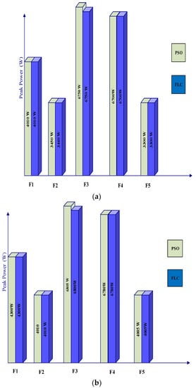 Increases of 10.9% and 11.3% in the tracked power with crystalline and thin film PV arrays, respectively, are recorded under fault scenario F2. It can be clearly seen that 10.6% and 9.6% increases in the tracked power with crystalline and thin film PV arrays are computed during occurrence of fault scenario F3. The details of the increase in power through the proposed FL and PSO schemes under all fault scenarios are shown in Figure 9. Both intelligent control schemes successfully tracked global power peaks under difficult fault scenarios.
