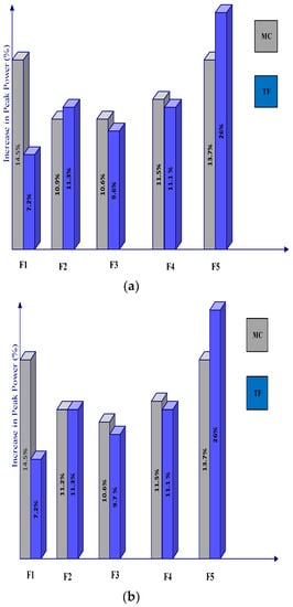 Percentage increase in peak power from MC and TF PV arrays under various faults.