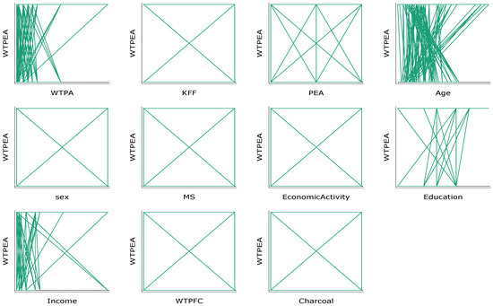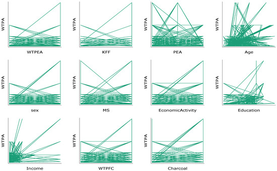 The hypothetical WTPEA results illustrated that 960 (80%) were willing to pay for the alternative energies monthly, and 236 (20%) were not willing to pay (Table 3 and Figure 5). The survey respondents’ results demonstrated that 59% (702) preferred gas for their household cooking, 34% (408) preferred hydroelectricity, and 8% (90) chose biogas (Table 3 and Figure 6 and Figure 7). The plot of the WTPEA against other variables also shows the distribution of the given variables against it (Figure 7).