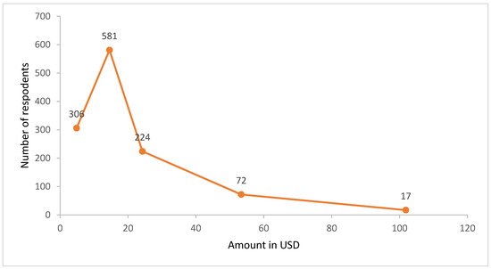There were 224 (19%) of the total respondents who offered between USD 20 and USD 30, with a cumulative percentage of 93%. Moreover, there were 72 (6%) and 17 (1%) who were willing to pay an amount between USD 50 and USD 60 and >100, respectively (Figure 8 and Figure 9).