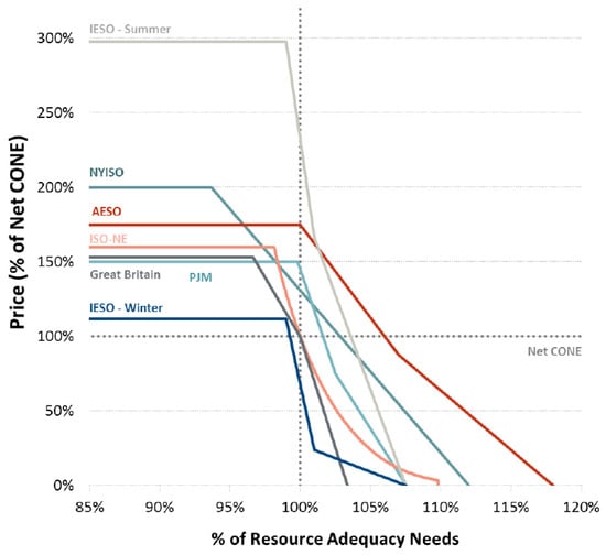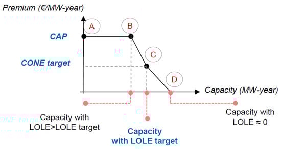 Apparently, the value of the key parameters that define the exact shape of the demand curve (e.g., price cap, target capacity, CONE target, and excess capacity, see points A–D in Figure 2 []) may vary among the countries, as shown in Figure 1 [].