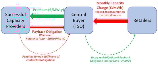 In most cases, capacity mechanisms are financed through a charge that is imposed by the TSO on the final end-consumers, either directly or through their electricity suppliers on a monthly basis. The charging amount is usually computed on the basis of the user’s contribution to peak system load. Particularly for ROs, the amount of this charge corresponds to the aggregated premiums paid to the capacity providers, minus the amount that capacity providers return to the TSO, when capacity providers sell electricity to the short-term market above the strike price [].