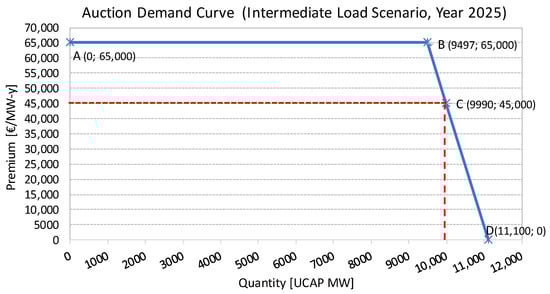 Regarding the design of the demand curve, Figure 1 illustrates a comparison of various demand curves from different capacity mechanisms worldwide [], while Figure 2 provides a detailed view of the demand curve of the Italian capacity mechanism []. A vertical demand curve for the procurement of a fixed quantity equal to the target requirement would be the easiest option. However, a vertical demand curve results in noteworthy capacity price volatility, is prone to market power exercise, and does not recognize the gradual change in marginal reliability value, as capacity requirements vary []. These inefficiencies are overcome by the downward-sloping design, which is the most popular and has been adopted in Italy, Poland, Great Britain, Ireland, PJM and Belgium only for the main auctions. A downward-sloping demand curve indirectly defines the precise volume that the central buyer purchases in the auction. In other words, if the offered price remains below a certain level (e.g., the value of CONE), the central buyer will buy additional capacity and, on the other hand, if the offered price of capacity lies above the CONE, the central buyer will procure less quantity.