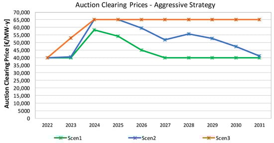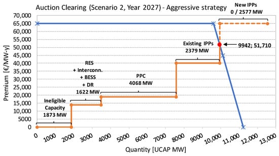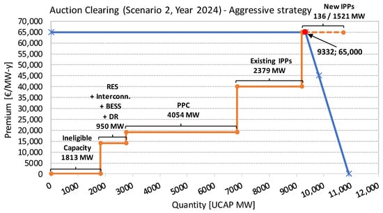 In the descending clock auctioning format, the auction operator sets a high price in the first round of the auction and eligible capacity providers place their bids to declare the amount of capacity they want to sell at that price. This is a repetitive procedure in consecutive rounds following a pre-defined schedule. In each round, capacity units can place their exit offer in order to withdraw from the following auction rounds, according to specific auction rules. Exit offers are finally sorted in order of increasing exit prices to formulate the supply curve. The procedure terminates when the auction finds the lowest price, at which the supply curve intersects with the demand curve [,].