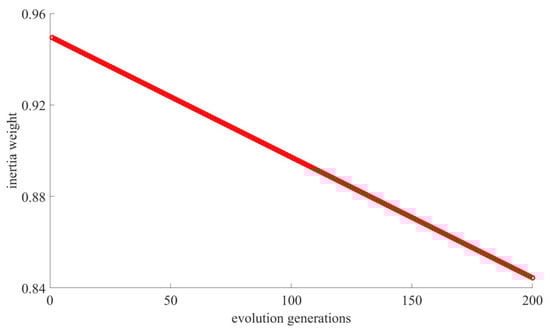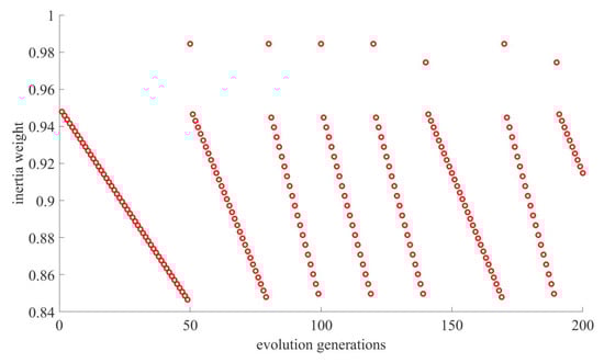 The above strategy is equivalent to dividing the entire iterative cycle into several parts, each of which uses an LDW-PSO with increasing disturbances. In this way, the inertia weight can be controlled in a suitable range in real time, so as to more effectively take into account the shortcomings of the PSO, which are easy for local convergence and slow convergence in iteration. As a result, the improvement of the algorithms computational efficiency can be carried out. The relation curve between the specific inertia weight of the above scheme and the population evolution algebra t is shown in Figure 3.
