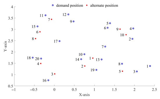 The distribution map of the above-mentioned EV charging demand community geometric centers and charging station alternative addresses is shown in Figure 5.