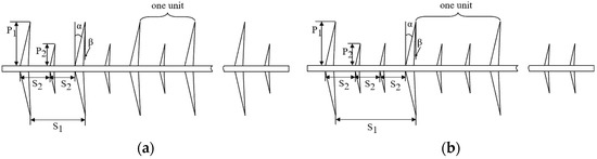 The composite insulator structure of two different shed combination modes is shown in Figure 1, where P1 is the radius of the large shed, P2 is the radius of the small shed, S1 is the distance between two large sheds, S2 is the distance between two adjacent sheds, α is the up-shed angle, and β is the down-shed angle. Settings: α = 12°, β = 7°, P1–P2 ≥ 20 mm, S1 ≥ 80 mm (large/small) or S1 ≥ 90 mm (large/small/small).
