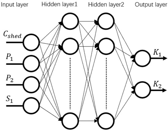 A four-layer BP neural network model was established, with large shed extension P1, small shed extension P2, large shed spacing S1, and large and small shed combination mode variable Cshed as inputs, and K1 and K2 as outputs. Among them, Cshed is used to digitize the combination of large and small sheds to convert them into a form that is easy to use by machine learning algorithms. When Cshed = 0, the input is the shed data of the “big/small shed” combination, and when Cshed = 1, the input is the shed data of the “big shed/small/small shed” combination.
