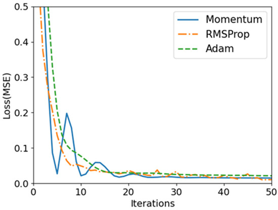 For the neural network model, different algorithms in the BP will affect the performance of the neural network, e.g., the convergence speed and the accuracy of the prediction. Common optimization algorithms include mini-batch [19], gradient descent with momentum, RMSProp (Root mean square propagation) gradient descent, and Adam gradient descent [20]. The mini-batch algorithm is used in the case of a large amount of data, and will not be discussed in this article. This paper compares the results of three algorithms: gradient descent with momentum, RMSProp gradient descent, and Adam gradient descent. The principles of the three algorithms are discussed below: