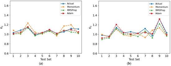 Comparison of model prediction results. (a) Prediction error for K1; and (b) Prediction error for K2.