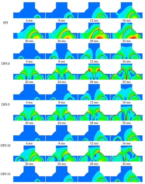 DPI-0 has two ignition sources, producing two flames. At the same time, the flame surface area of DPI-0 is larger than SPI, which can burn more fuel and accelerate the global combustion rate in the constant volume combustion chamber. With the increase in ignition interval, the occurrence time of flame 2 is delayed and the flame surface area decreases at the same time. This indicates that the flame surface area of DPI-0 is the largest and the global combustion speed is the fastest. With the propagation of the flame, a low-speed zone appears inside the flame, which indicates that the two flames generated by DPI have mutual inhibition effect, resulting in a speed inside the flame that is opposite to the direction of the flame, resulting in the decrease in the air flow speed.