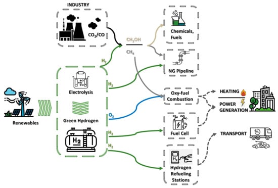 The intermittency of renewable energy sources (solar, wind) is an obstacle to continuously producing green hydrogen and would require a reliable and cost-efficient energy storage system []. Several energy storage technologies exist including pumped hydro storage, compressed-air energy storage, electrochemical storage, mechanical energy storage, and thermal energy storage []. Their classification varies in terms of discharge time of each technology, the scale in which they can be deployed, and their short-term or long-term storage capabilities. The readily available and mature storage solution, in terms of implementation for the WM region, is pressurized storage tanks where hydrogen is either in gas or liquid form (liquefaction). The produced hydrogen from the renewable-powered electrolysis can be used either as a fuel for transport, displacing oil in light vehicles, railways, and marine applications, or as a feedstock for industrial applications. An alternative potential use of the produced hydrogen is its conversion into methane by exploiting the CO2 emissions from the nearby power plants. Figure 1 gives a schematic representation of the sections coupled under the use of hydrogen, their main medium of energy storage and transfer, and sectors that use it as their feedstock.