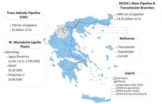 - Ministry of the Environment and Energy Hellenic Government Greece. Just Transition Development Plan of Lignite Areas; Ministry of the Environment and Energy Hellenic Government Greece: Athens, Greece, 2020. [Google Scholar]
