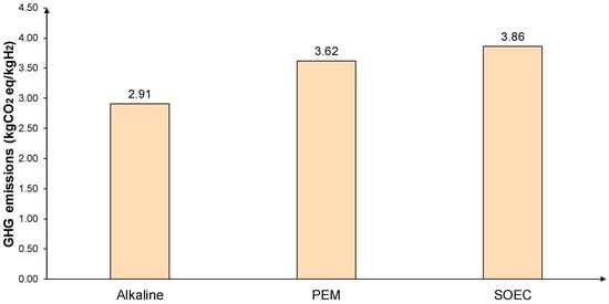 Hydrogen production, storage, compression, transportation, and distribution are considered as different processes in this analysis. However, many of these processes are required in most of the cases studied. To create a base for comparison [,,,], the GHG emissions of the above processes are presented in Figure 3. In this analysis, the input–output data are sourced from both the relevant literature and the Ecoinvent 3.6 database, which is integrated into the life-cycle analysis software SimaPro version 9.1 PhD. These data have been adapted to align with the specific hydrogen systems being investigated. The analysis is carried out assuming PV electricity as the source of the power required for the processes.