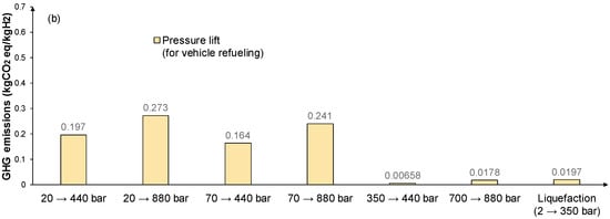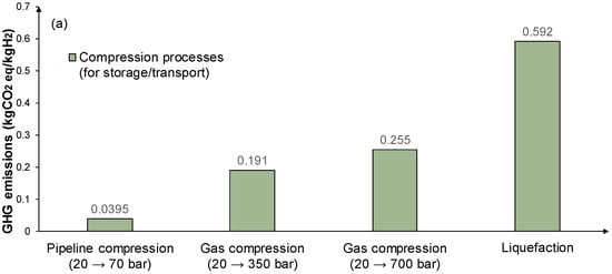 Figure 4 considers the GHG emissions of hydrogen compression/liquefaction for transportation/distribution, storage, and use for refueling purposes. The investigated options involve hydrogen gas compression at 20, 350, and 700 bar, and liquid form in cryogenic storage at −253 °C and at atmospheric pressure. Hydrogen transportation/distribution through gas pipelines is assumed at 20 bar and 70 bar, and when transported by trucks, hydrogen is in liquid form. When the refueling of vehicles is considered, buses require 350 bar of pressure (with a pressure lift up to 440 bar) and cars require 700 bar (with a pressure lift up to 880 bar) [].