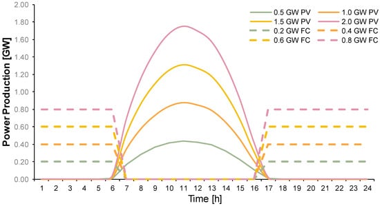 In the case of PVs, fuel cells can play the role of shifting the peak power production of PVs towards night hours. As an example, the daily production curves of 0.5–2 GW PV plants are shown in Figure 5. In the same figure, the fuel cell production curves are shown with dashed lines of the same color to their respective PV couple. Part of the produced hydrogen by the PV can be used to produce power during the hours with no sun. This process establishes fuel cells as a complementary technology to the PV, meaning that these two technologies can have a level power production curve when operating in conjunction with each other. The resulting hydrogen demand for the operation of various fuel cell module sizes depending on the installed PV capacity is presented in Table 3. The demand assumes an average 14 h of fuel cell operation daily. Larger PV installations naturally translate to larger fuel cell sizes in order to produce a curve as flat as possible.