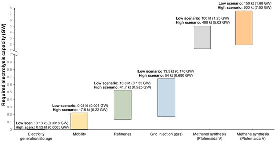 Figure 6 illustrates the capacity range (kt) that the deployment of each technology requires in terms of hydrogen amounts as well as electrolysis requirements for the deployment scenarios that were investigated in this work. It is important to understand that in the overall WM, the PV capacity that can be installed is limited due to spatial constraints as mentioned in Section 2. Consequently, this puts an upper constraint on the hydrogen amount that can be produced via renewable energy. Assuming that H2 production units start being built immediately, it will take several years to achieve the maximum capacity of the WM region which can be around 8.1 GW with a production of 210 kt H2/y. In addition, electrolysis capacity demands (GW) far exceed the current readiness for deployment of electrolysis plants worldwide.