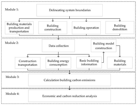 LCA has three broad methods: process-based, economic input–output, and hybrid. Among them, process-based methods account for the majority of research in the field of construction technology due to their systematic, accurate, detailed analysis and compliance with industry standards [34]. This article presents an enhanced framework for analyzing building carbon emissions using BIM-LCA based on the process analysis method. The framework is applied to a large public building for quantitative research. The study comprises four main modules: (1) delineating system boundaries, (2) collecting data and constructing the building model, (3) calculating building carbon emissions, and (4) economic and carbon reduction analysis. The specific framework for building carbon emissions analysis based on BIM-LCA is illustrated in Figure 1.